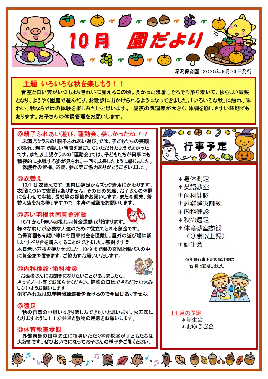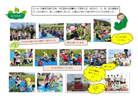 深沢保育園の保育目標として、すなおに・あかるく・すこやかにの三項目の実現を目指し、自然に学ぶという幼児の姿を大切にしたいと考え、環境作りに努力しております。