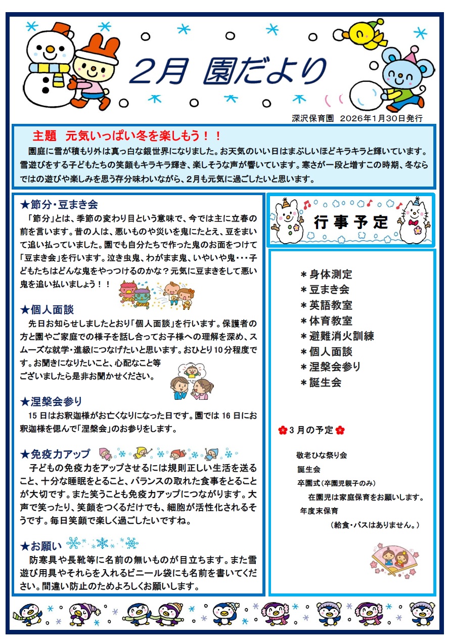 長岡市深沢町の深沢保育園 深沢保育園の保育目標として、すなおに・あかるく・すこやかにの三項目の実現を目指し、自然に学ぶという幼児の姿を大切にしたいと考え、環境作りに努力しております。 日々の園の活動も連絡帳アプリ等を通じて保護者様に伝え、園児だけではなくご家族皆様とコミュニケーションを取っていきたいと考えております。どうぞお気軽にお問い合わせください。 園からのお知らせ 園だより 今月の献立 各種書類ダウンロード 深沢保育園について 行事一覧 2026年1月豚汁会とシャカシャカおにぎり2026.01.222025年12月おゆうぎ会2025.12.242025年10月遠足2025.10.292025年10月えだまめとり2025.10.152025年10月運動会2025.10.092025年8月1年生を迎える会・お楽しみ会2025.08.202025年7月お泊り保育2025.07.162025年7月七夕会2025.07.09 〉過去の行事はコチラから お問い合わせ 社会福祉法人 清泉会 深沢保育園 〒940-2135 新潟県長岡市深沢町2010-3 TEL:0258-46-5480 FAX:0258-46-5710