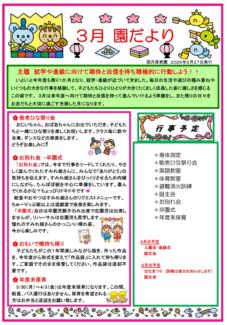 長岡市深沢町の深沢保育園 深沢保育園の保育目標として、すなおに・あかるく・すこやかにの三項目の実現を目指し、自然に学ぶという幼児の姿を大切にしたいと考え、環境作りに努力しております。 日々の園の活動も連絡帳アプリ等を通じて保護者様に伝え、園児だけではなくご家族皆様とコミュニケーションを取っていきたいと考えております。どうぞお気軽にお問い合わせください。 園からのお知らせ 園だより 今月の献立 各種書類ダウンロード 深沢保育園について 行事一覧 2026年2月豆まき会2026.02.252026年1月豚汁会とシャカシャカおにぎり2026.01.222025年12月おゆうぎ会2025.12.242025年10月遠足2025.10.292025年10月えだまめとり2025.10.152025年10月運動会2025.10.092025年8月1年生を迎える会・お楽しみ会2025.08.202025年7月お泊り保育2025.07.16 〉過去の行事はコチラから お問い合わせ 社会福祉法人 清泉会 深沢保育園 〒940-2135 新潟県長岡市深沢町2010-3 TEL:0258-46-5480 FAX:0258-46-5710